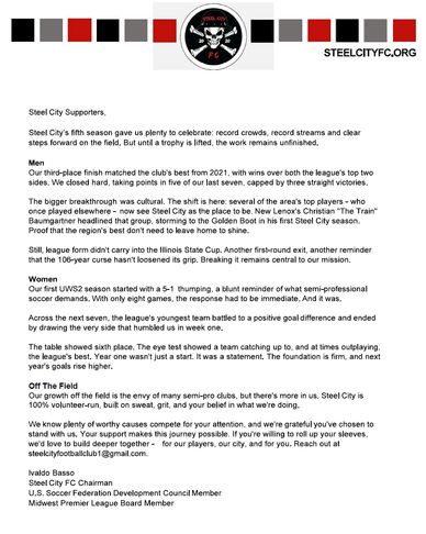 Joliet (October) Chairman Basso has penned his annual letter to the club's supporters.