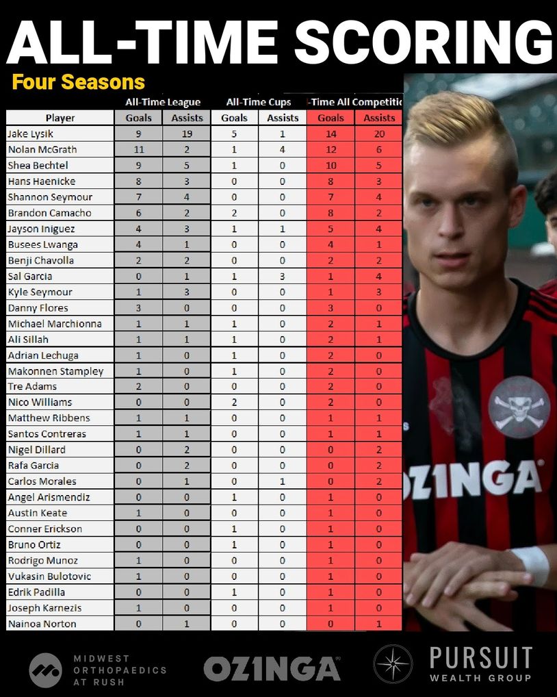 Jake Lysik tops Steel City's scoring charts after four seasons. Nolan McGrath, the black-n-red's first ever goal scorer has an impressive goals per game clip, along with Shea Bechtel, who won the league's Golden Boot in 2022.